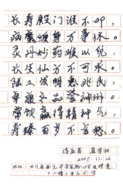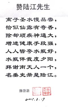 凡尊重中國(guó)古代養(yǎng)生智慧的患者,堅(jiān)持“已饑方食”和定時(shí)主動(dòng)補(bǔ)水者,均可祛病康復(fù)。如牡丹江醫(yī)學(xué)院87歲的張鵬圖飲用半年后高血壓未痊愈,陸江與他通話交流,了解他原先每日主食4兩,建議他用“已饑方食”減少主食肉食量,他理解后,將每日主食減為3兩,少吃兩塊肉,飲用一年治愈26年的冠心病和高血壓。他2003年5月31日來(lái)信說(shuō):“飲用卓康小分子團(tuán)水是根治高血壓、冠心病、糖尿病的一把金鑰匙,是填補(bǔ)醫(yī)學(xué)空白,為人類造福,應(yīng)推廣該產(chǎn)品?!?/strong>