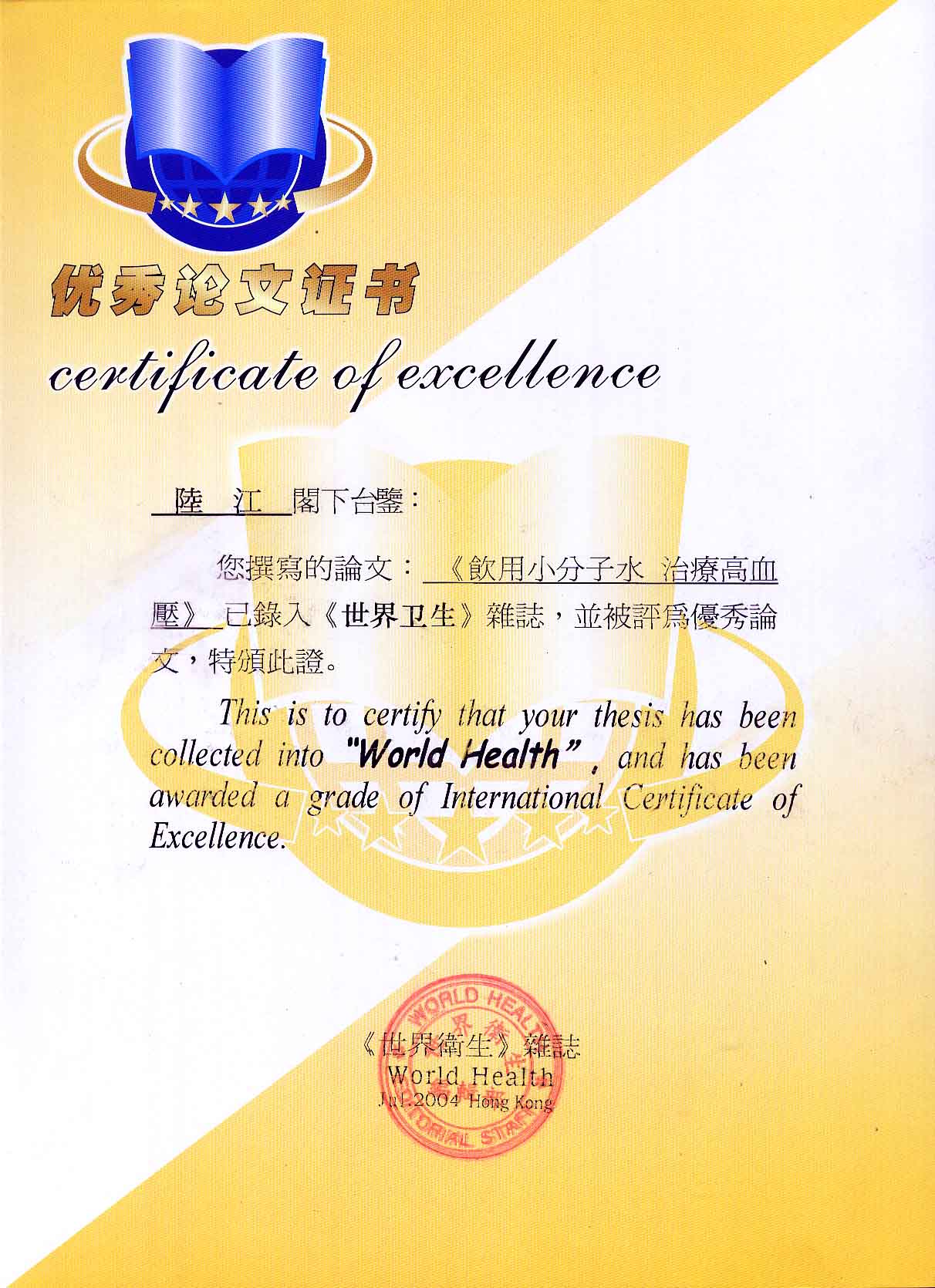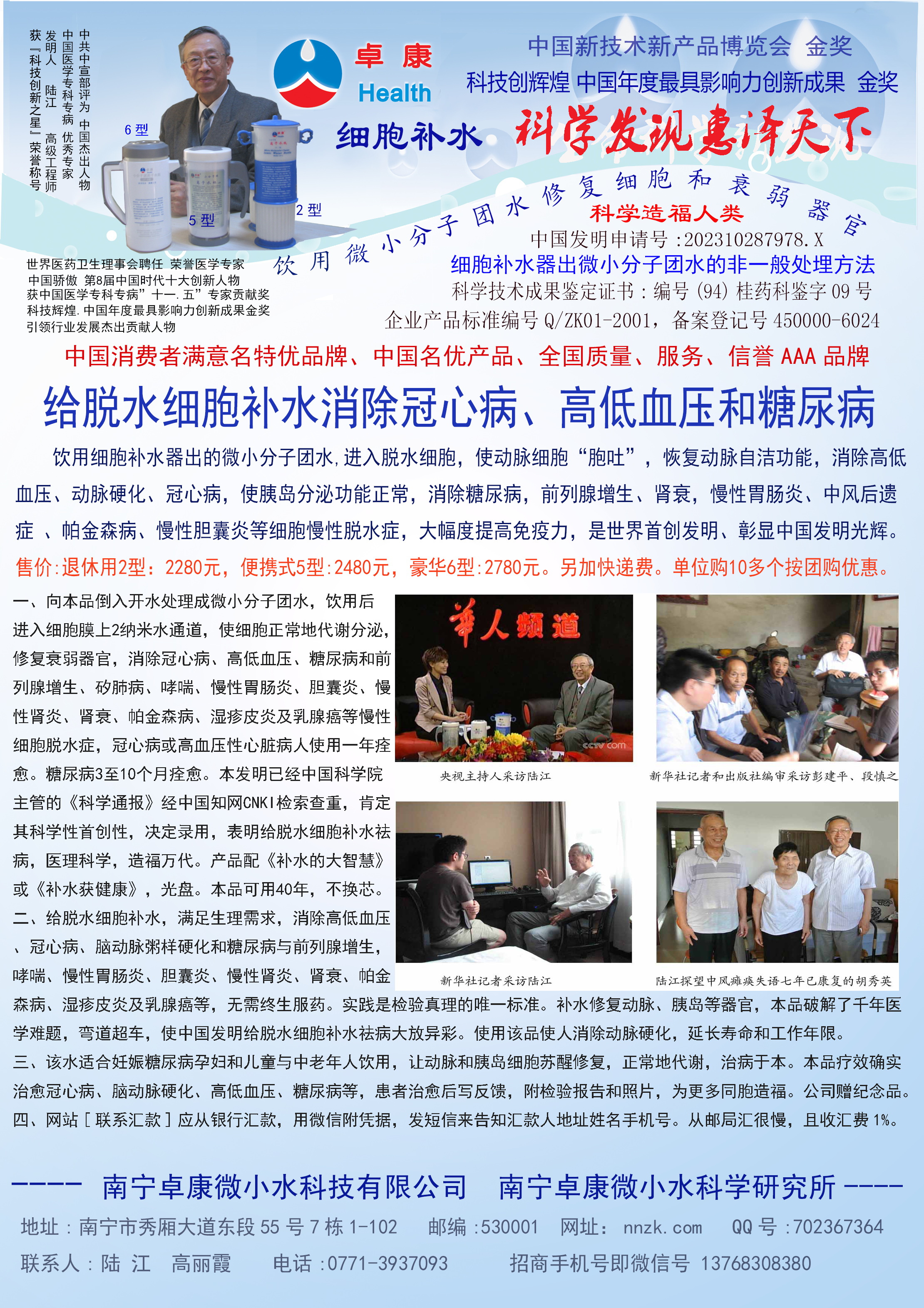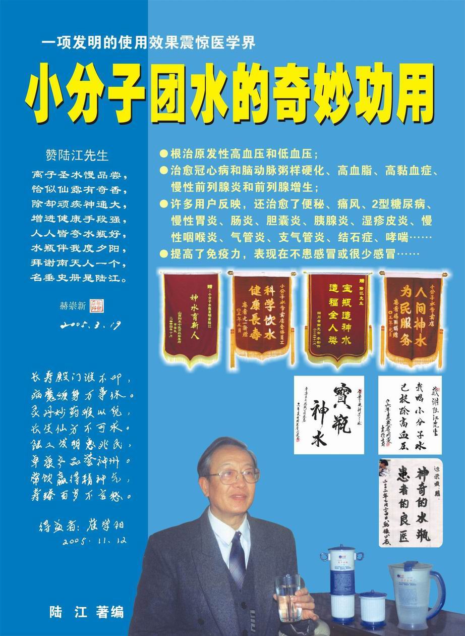 人類幾千年來(lái)患以上病癥需終生服藥,幾十年也不能治愈。可是我國(guó)南寧的高級(jí)工程師陸 江,于1990年想根治高血壓,研究發(fā)明了離子水瓶,處理出微小分子團(tuán)水供飲用,經(jīng)過(guò)醫(yī)院臨床試用和專家鑒定,1999年獲中國(guó)發(fā)明專利權(quán),產(chǎn)品于2000年投放市場(chǎng)后一直跟蹤調(diào)查,據(jù)全國(guó)各地用戶反饋:祛除了高低血壓、糖尿病和冠心病,并使前列腺增生、咽喉炎、鼻竇炎、慢性氣管炎、支氣管炎、矽肺病、哮喘、慢性胃炎、腸炎、慢性膽囊炎、慢性腎炎、腎衰、膀胱炎、便秘、痔瘡、風(fēng)濕性關(guān)節(jié)炎和濕疹皮炎及中風(fēng)后遺癥等病癥不藥而愈。為什么喝微小水能治20多種病?陸 江從1991年德國(guó)科學(xué)家發(fā)現(xiàn)細(xì)胞膜水通道僅為2納米獲得啟發(fā),認(rèn)為多種器官患病是因細(xì)胞脫水,不能正常代謝和分裂增殖,才使器官細(xì)胞減少致衰弱萎縮而形成細(xì)胞缺水性病癥。22年來(lái)的實(shí)踐有力地支持了“細(xì)胞脫水致病”這一重要論點(diǎn),表明喝微小水可滿足細(xì)胞的生理需求,補(bǔ)水就能祛病,是生命科學(xué)新亮點(diǎn)。