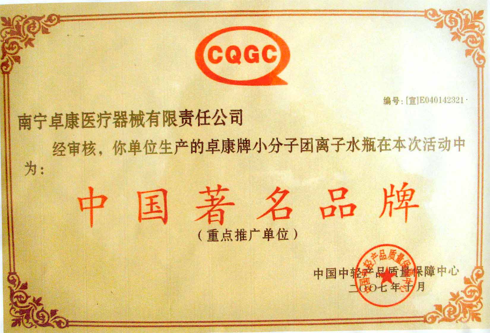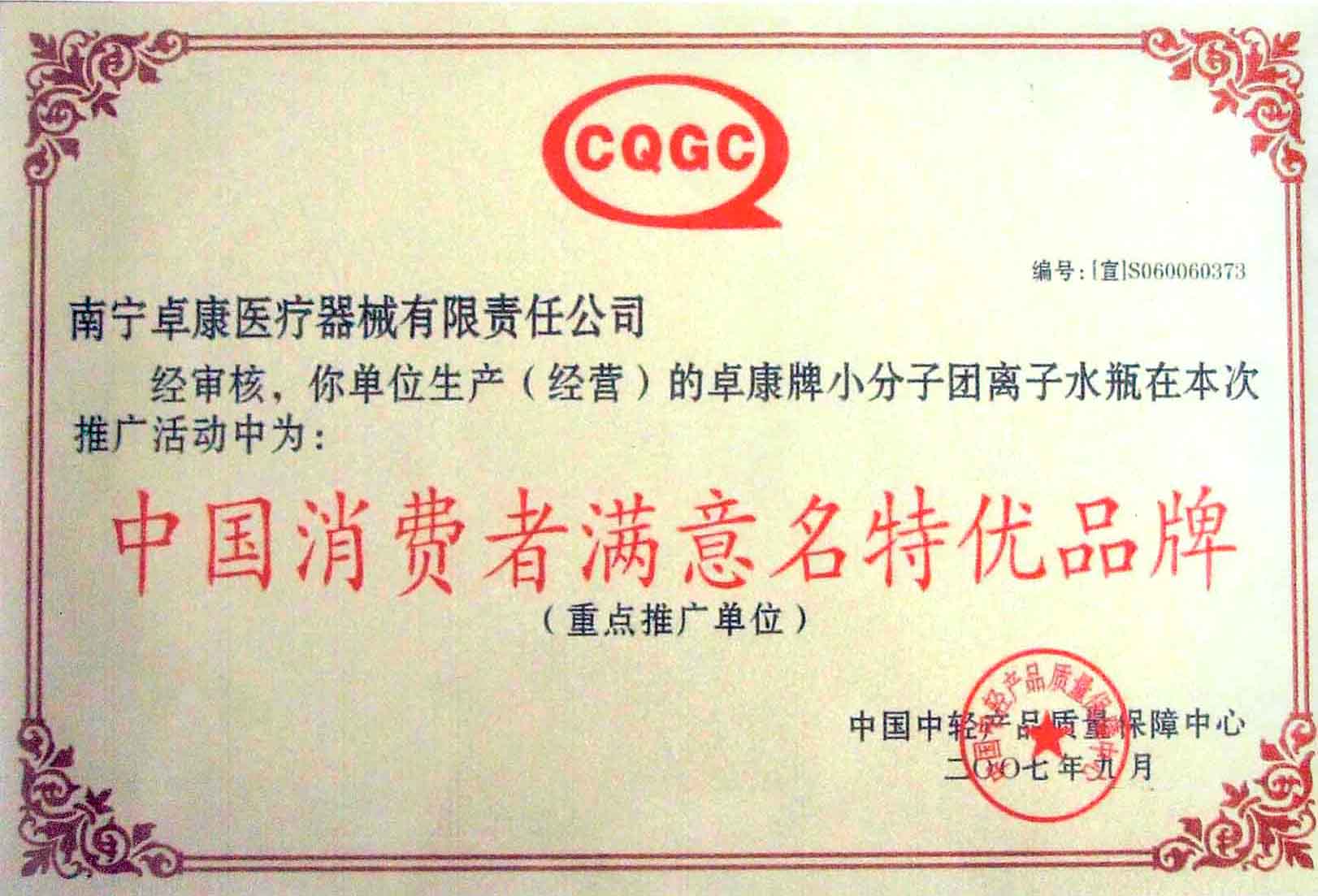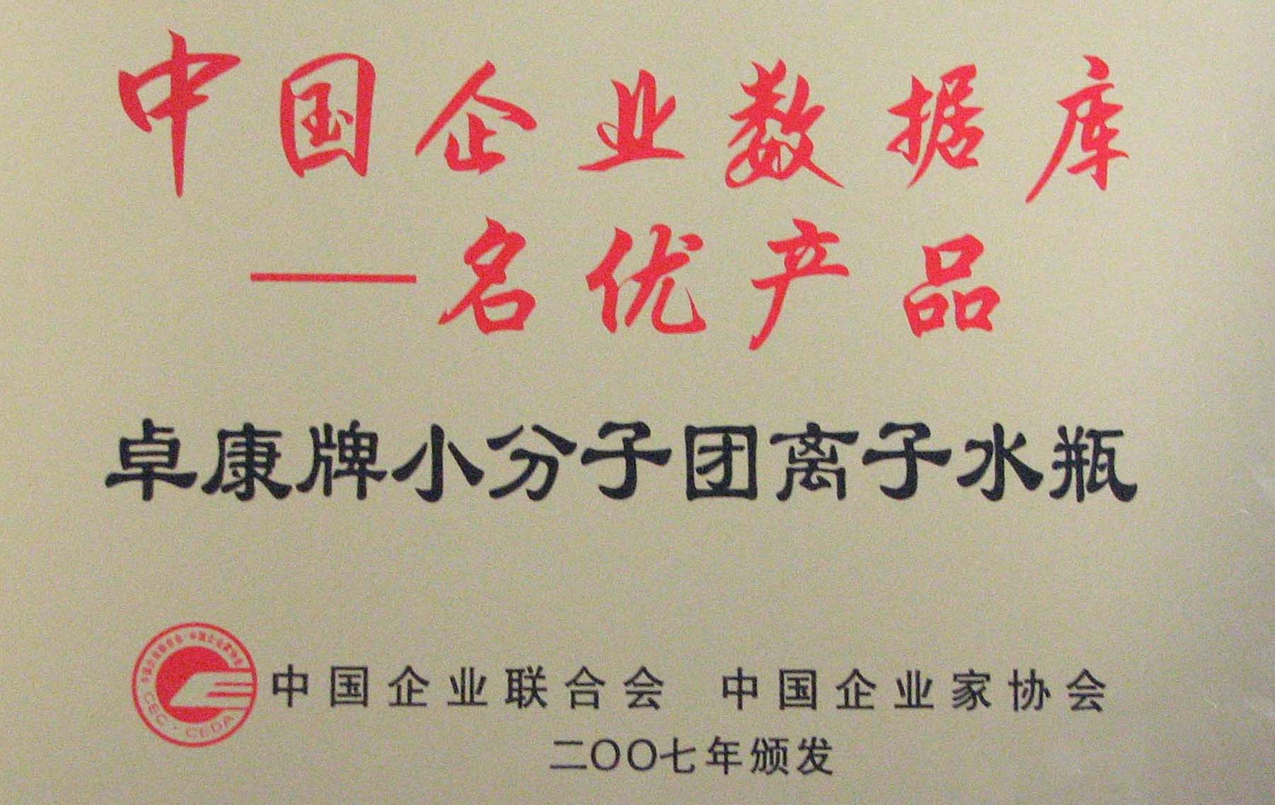 卓康牌離子水瓶榮獲中國(guó)企業(yè)名優(yōu)產(chǎn)品[點(diǎn)小圖見(jiàn)大圖]、中國(guó)著名品牌稱號(hào)[點(diǎn)小圖可見(jiàn)大圖]