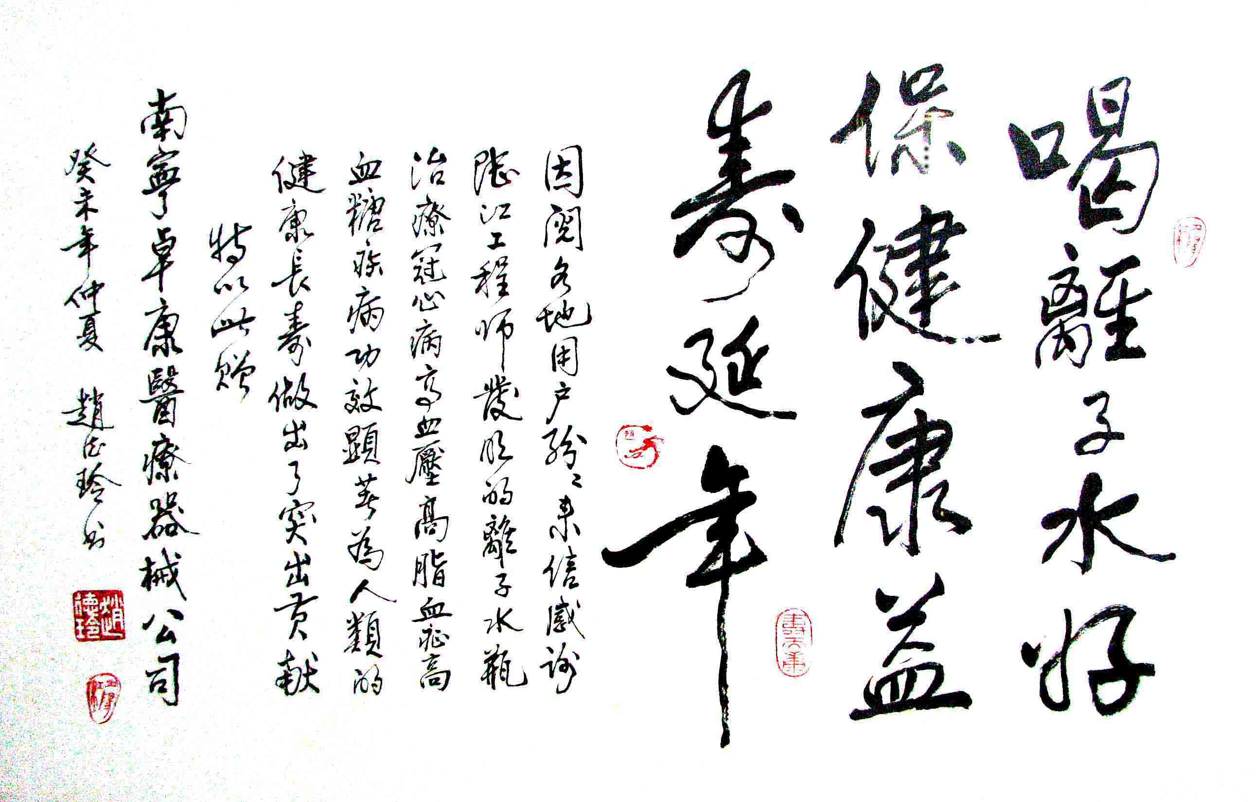 - -- 幾千年來(lái),人類靠醫(yī)藥不能根治冠心病、高血壓和糖尿病,如想根治,那是夢(mèng)想。可是,我從中國(guó)基礎(chǔ)醫(yī)學(xué)研究成果受到啟發(fā),研發(fā)了一種發(fā)明產(chǎn)品,處理出微小分子團(tuán)水讓人飲用,實(shí)現(xiàn)了人類這一夢(mèng)想!患者飲用后遠(yuǎn)離了冠心病、高血壓和2型糖尿病。這一成果曾經(jīng)過(guò)臨床試用和專家鑒定,作為準(zhǔn)字號(hào)醫(yī)療器械讓廣大患者飲用,療效進(jìn)行跟蹤調(diào)查。很多患者的反饋情況令人感動(dòng),我放在公司網(wǎng)站上(nnzk.com),震撼了醫(yī)學(xué)專家,也使廣大同胞受到啟發(fā)。人們盼望飲用它給細(xì)胞補(bǔ)水,治愈多種病癥,既省錢,又安全,而且延長(zhǎng)壽命。