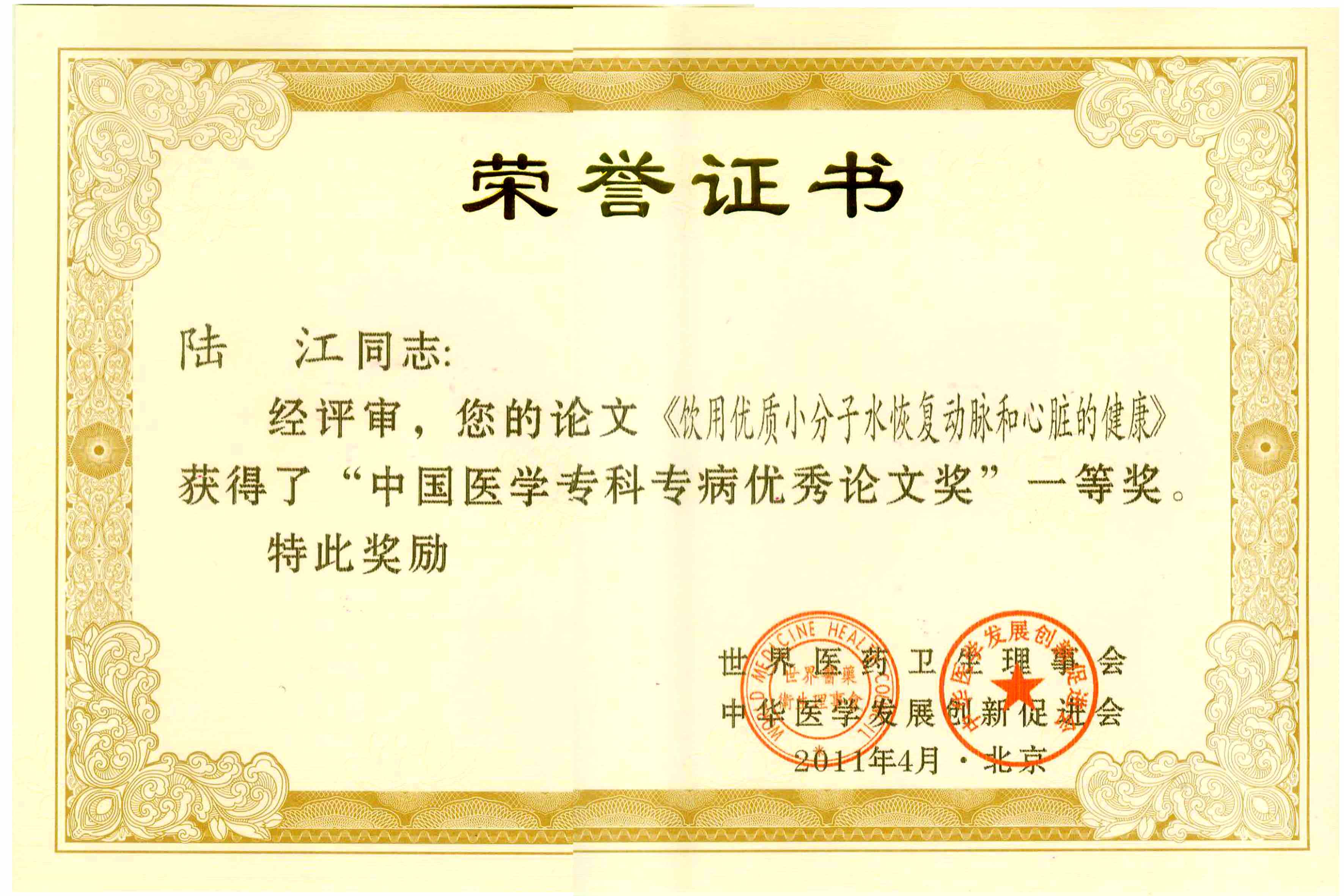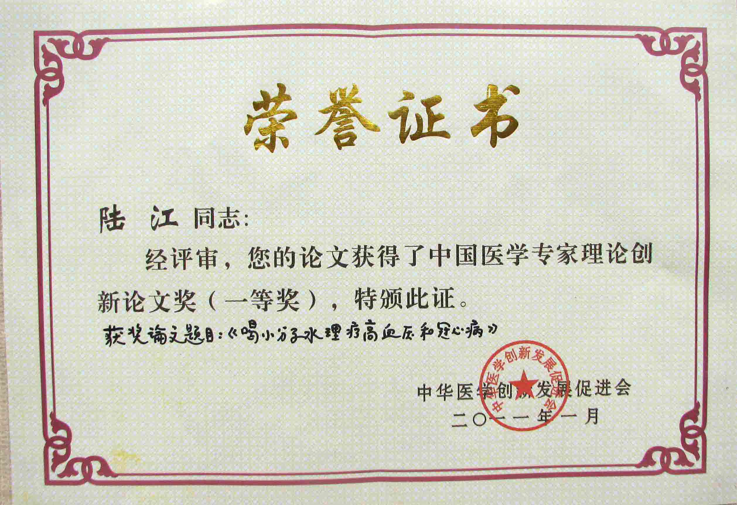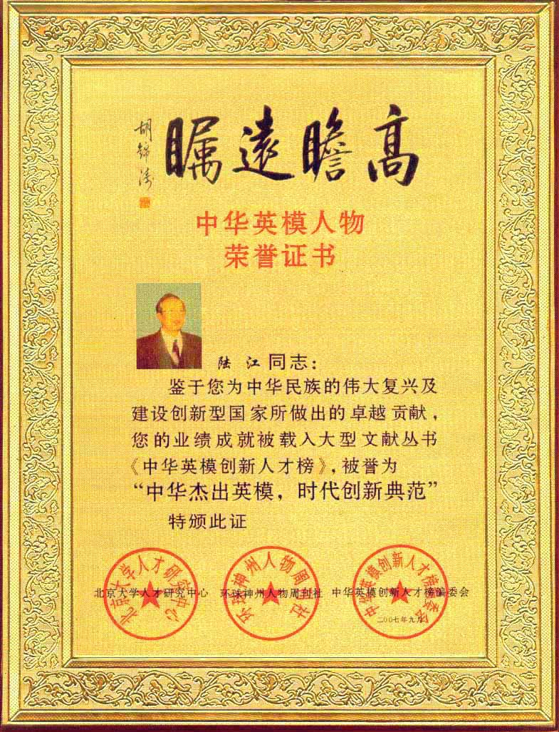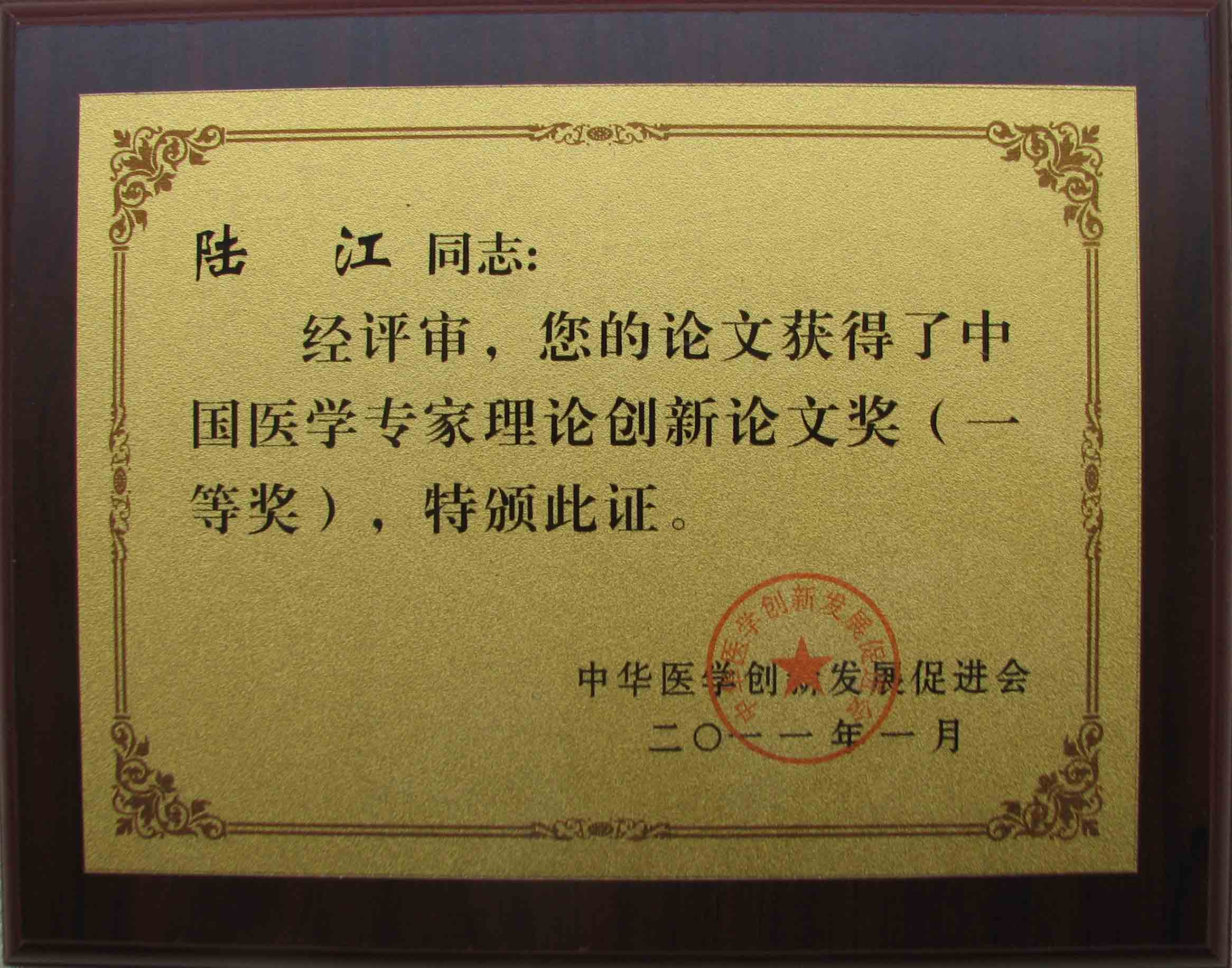 陸江的論文獲一等獎(jiǎng)榮譽(yù)證書(shū)-- 陸江論文獲創(chuàng)新論文獎(jiǎng)牌