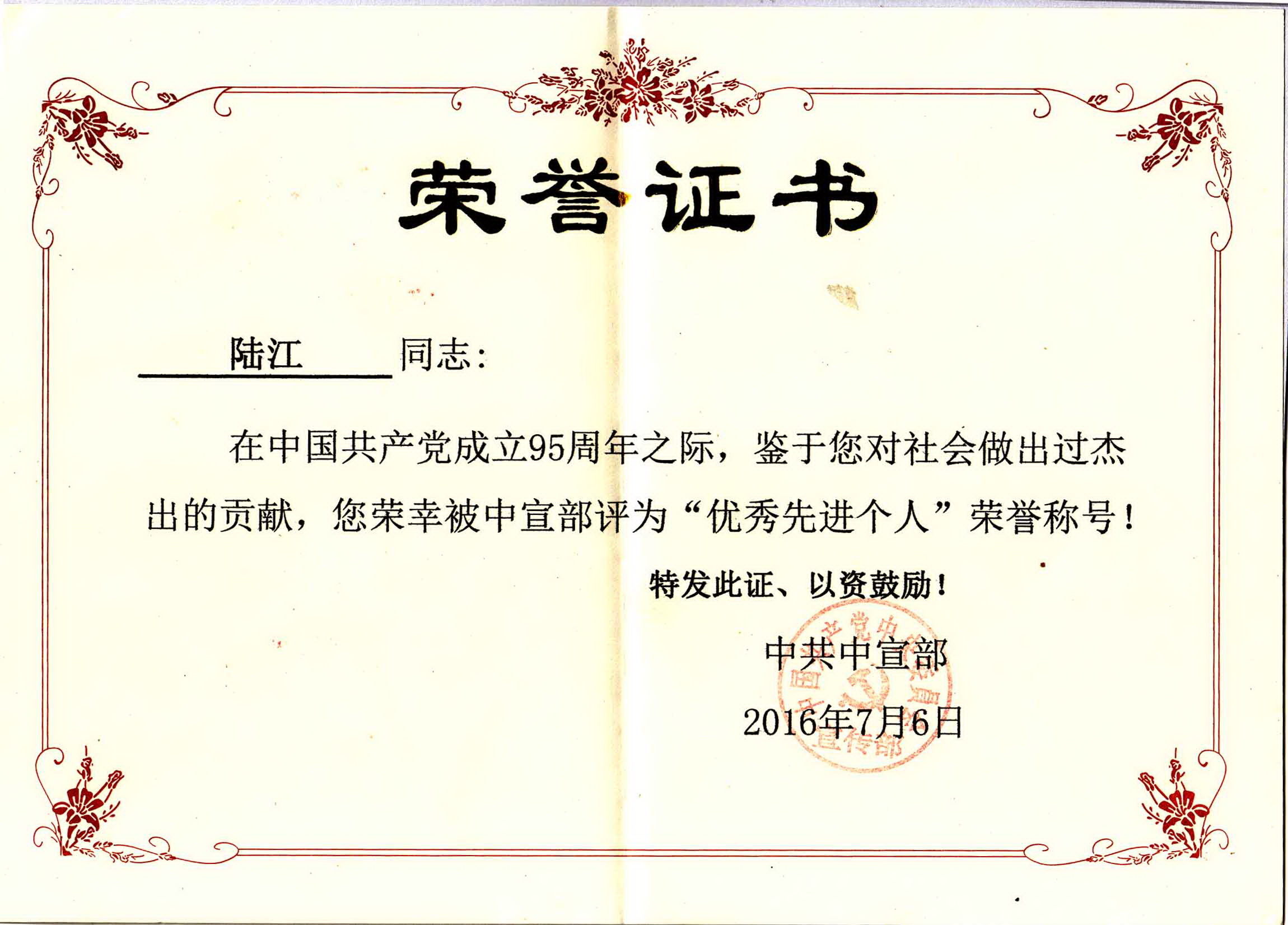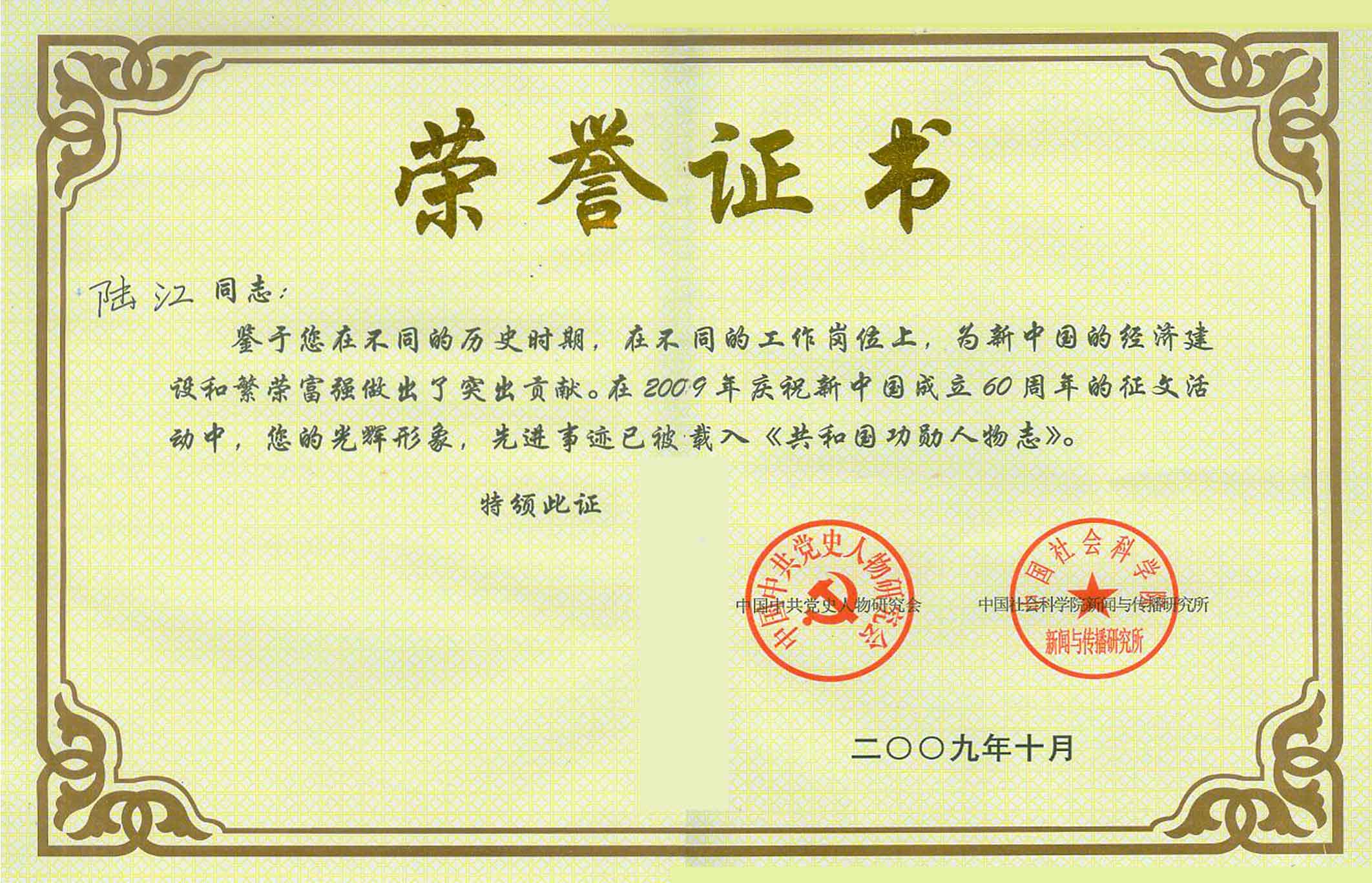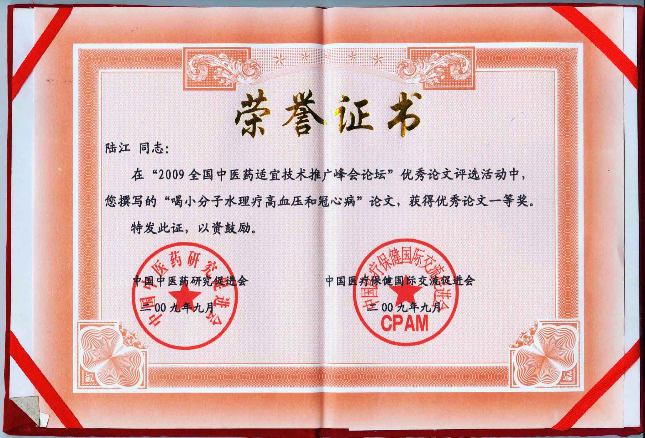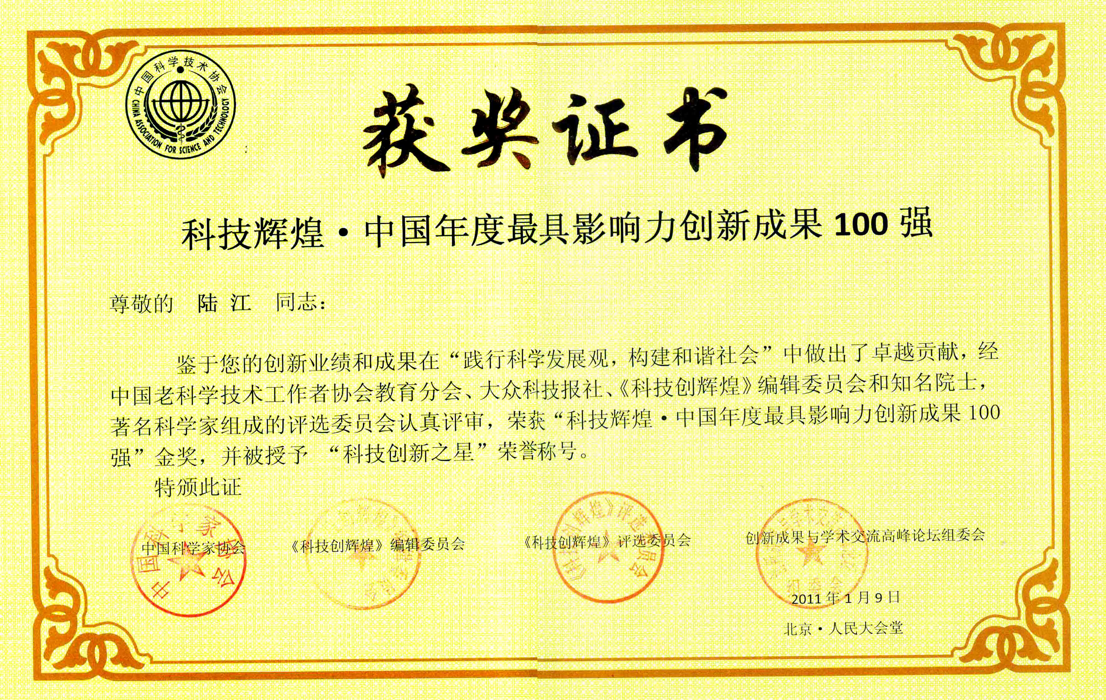 陸江的論文獲一等獎(jiǎng)榮譽(yù)證書(shū)-- 陸江論文獲創(chuàng)新論文獎(jiǎng)牌