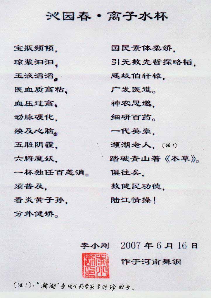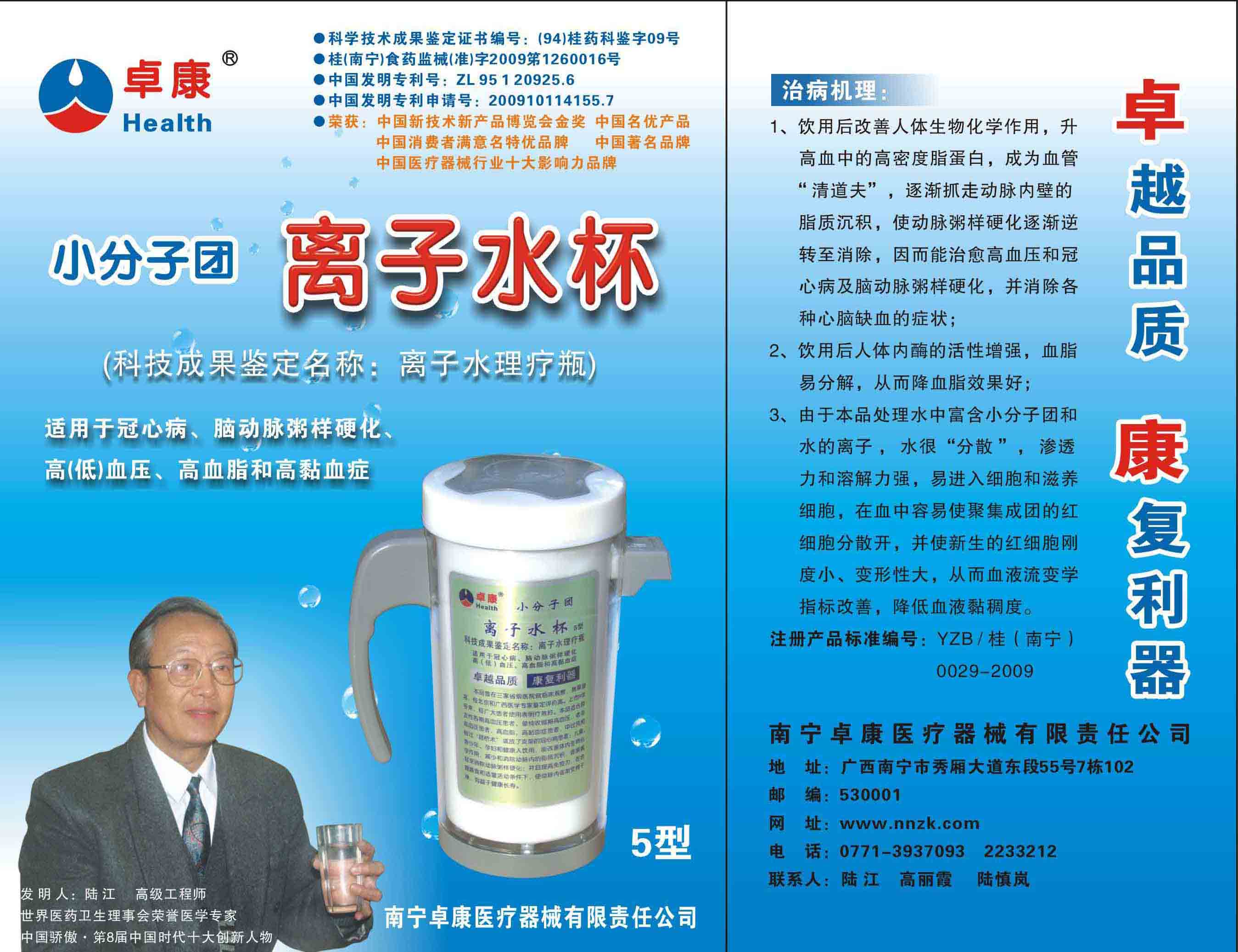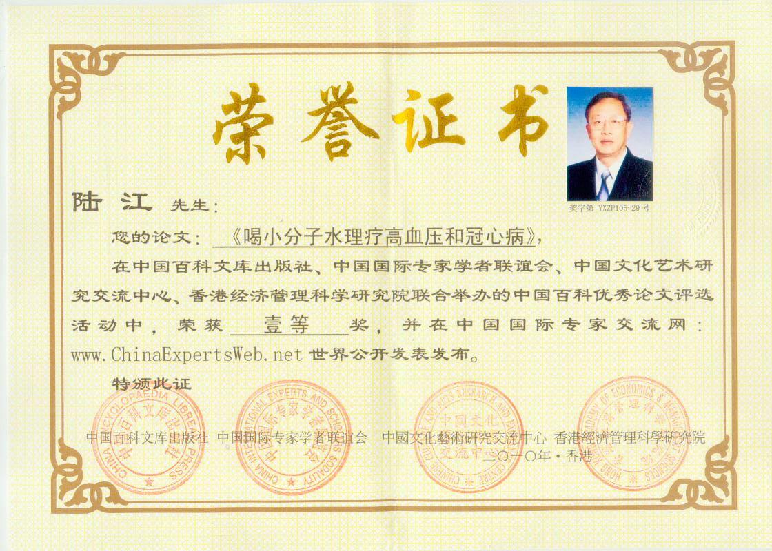 -----我是從事建筑的高工,本來(lái)沒(méi)有資格去攻克醫(yī)學(xué)難題,卻為了自身健康才扣響醫(yī)學(xué)的大門。由于我1990年患高血壓,因怕中風(fēng)才研究發(fā)明了離子水瓶,我把水處理成微小分子團(tuán)水,飲用后治愈了高血壓。便于1993年底送到三家省級(jí)醫(yī)院做臨床試用4個(gè)月。經(jīng)北京和廣西醫(yī)學(xué)專家鑒定:"降脂降壓效果好"," 能擴(kuò)大心腦動(dòng)脈流量,改善心腦電圖以及微循環(huán)","對(duì)治療心腦動(dòng)脈粥樣硬化、高血壓、高血脂有良好的醫(yī)療保健作用。""產(chǎn)品的技術(shù)性能和療效達(dá)到了同類產(chǎn)品的國(guó)內(nèi)領(lǐng)先水平,經(jīng)廣西醫(yī)學(xué)科學(xué)情報(bào)研究所檢索,未見(jiàn)國(guó)外有類似報(bào)道。"中國(guó)醫(yī)學(xué)科學(xué)院張正國(guó)教授從美國(guó)國(guó)立醫(yī)學(xué)圖書(shū)館數(shù)據(jù)庫(kù)存Medline檢索英俄文資料,均未見(jiàn)類似報(bào)告。2000年上市后,我為了對(duì)消費(fèi)者負(fù)責(zé)而繼續(xù)觀察研究,一直通過(guò)《信譽(yù)卡》和《質(zhì)量跟蹤調(diào)查書(shū)》向患者承諾療效,請(qǐng)用戶使用6個(gè)月后反饋效果。和脂壓患者飲用2至5個(gè)月內(nèi),消除癥狀,停服藥物,血壓正常;冠心病患者飲用3~5個(gè)月逐漸減輕至消除心絞痛、房顫等癥狀,不再服藥,飲用1年左右心電圖正常,經(jīng)冠脈造影掃描無(wú)明顯狹窄,表明冠心病痊愈。大量患者還反映許多衰弱器官被修復(fù),讓前列腺增生、慢性咽喉炎、慢性氣管炎、支氣管炎、慢性胃炎、腸炎和膽囊炎等不藥而愈;2型糖尿病患者是因?yàn)橐葝u衰弱致病,飲用該水半年至一年,逐漸減藥至停藥,血糖尿糖正常,真正治愈2型糖尿病。中風(fēng)后遺癥患者飲用六七個(gè)月,可逐漸減輕至消除肢體和語(yǔ)言障礙,表明飲用該水能讓壽命很長(zhǎng)的神經(jīng)元細(xì)胞逐漸修復(fù),奇跡般地恢復(fù)肢體和語(yǔ)言功能。飲用后還使胸腺和脾臟兩個(gè)重要的免疫器官被修復(fù)和增強(qiáng),產(chǎn)生免疫細(xì)胞多,提高了免疫力,使人不生病或少生病。自此, 飲用微小分子團(tuán)水創(chuàng)造了攻克冠心病、高(低)血壓和糖尿病三大醫(yī)學(xué)難題的奇跡。人們對(duì)此感到不可思議,但實(shí)踐是檢驗(yàn)真理的唯一標(biāo)準(zhǔn)。