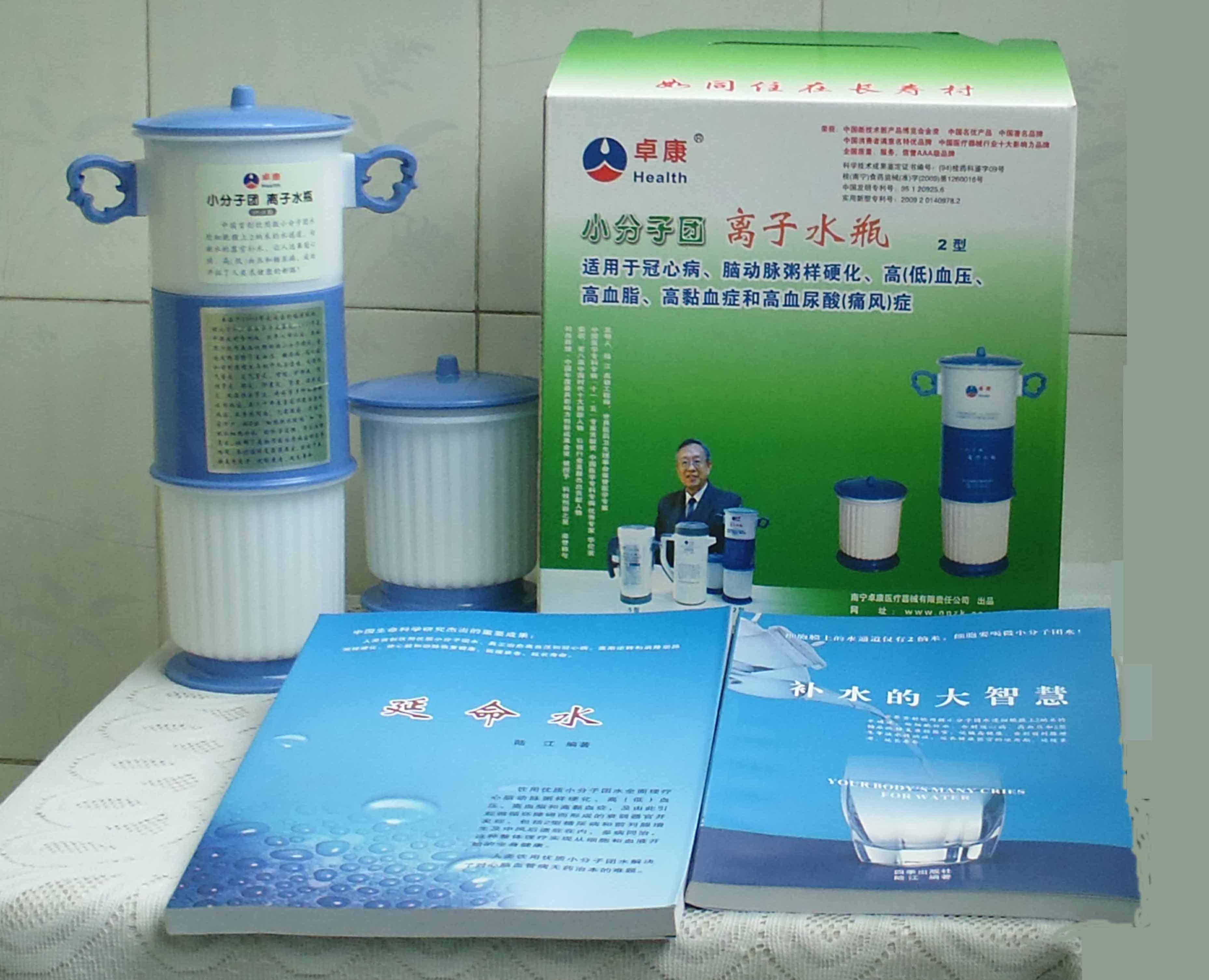 本品大量用戶的使用效果表明,能治愈冠心病、腦動(dòng)脈硬化、原發(fā)性高(低)血壓、高血脂、高粘血癥、高血尿酸癥(痛風(fēng))和2型糖尿病、衰弱器官并發(fā)癥(前列腺增生、腎衰與尿毒癥)及中風(fēng)后遺癥等療效好。產(chǎn)品配信譽(yù)卡。使用壽命30年,不換芯,易清洗。團(tuán)購(gòu)優(yōu)惠。從郵局匯款,匯費(fèi)1%,地址按本頁(yè)下方地址、聯(lián)系人寫(xiě)。從銀行匯款,請(qǐng)點(diǎn)擊[聯(lián)系匯款]欄,從工商銀行匯款,建設(shè)銀行、農(nóng)業(yè)銀行匯款,均免收匯費(fèi),匯款后20--30分鐘內(nèi)發(fā)短信,可用微信轉(zhuǎn)帳,均免匯費(fèi),微信號(hào)即手機(jī)號(hào)13768308380。匯款后,告知你的姓名和地址,我公司聯(lián)系人手機(jī)號(hào)是:13768308380。卓康牌離子水瓶為我公司獨(dú)家生產(chǎn),郵購(gòu)產(chǎn)品配《補(bǔ)水的大智慧》彩印書(shū)一本,另配四季出版社出版的新書(shū)《補(bǔ)水的大智慧》一本,并配光盤(pán)一張(含央視主持人釆訪陸江的對(duì)話視頻)。目前市場(chǎng)和"淘寶網(wǎng)"上有人兜售假冒的偽品,望讀者審察辯別真?zhèn)?,造假者剽竊假冒本公司的各種認(rèn)證、獲獎(jiǎng)獎(jiǎng)項(xiàng)、專利號(hào)和外包裝盒上的中英文字,包括科技成果的鑒定意見(jiàn)等,請(qǐng)讀者注意防偽。如何識(shí)別假貨?已經(jīng)買了假貨怎么辦?(請(qǐng)點(diǎn)擊[打假掠影][打假掠影])。